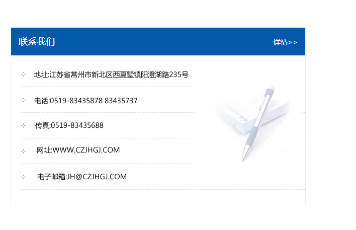 地址:常州市新北區友邦商務大廈1幢16、17層  電話:0519-85101652  傳真:0519-85112595  郵編:213022  網址:www_cz-jiayue_cn.gpbetc.com  郵箱:xiajifengaa@163.com